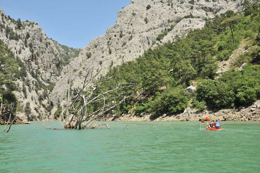 All visitors will be amazed by the surrounding scenery of the high Taurus mountain ranges, especially as there are numerous excursion boats on the reservoir. Some restaurants tempt with culinary local delights. Together with some friends we decided to go on a canoe tour on the Oymapinar Reservoir, which should lead us to the side valleys and thus to the point of influence of the Manavgat River into the reservoir. In addition to our inflatable Gumotex Palava, we were accompanied by two hardshell boats, which later caused wet pants, as much water had got into the boat. Relaxed, we first went across the reservoir into the side valley.