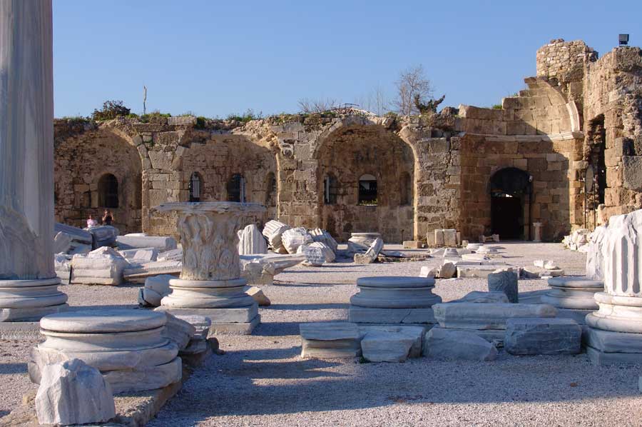 Almost exactly in the middle of Selimiye, where the ancient port lay, lie the remains of a smaller Roman bath, the harbor bath. Along the quays were probably arcades with storage houses, shops and inns. The silting of the harbor was a constant problem for Side, and a Roman proverb for a difficult and infinitely long work was "like the port of Side." When the original harbor sanded in the 5th century, a new harbor basin was built northwest of it.
