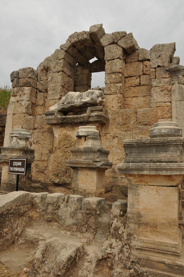 An inscription tells that the nymphaeum was dedicated to Artemis, Emperor Septimus Severus and his wife Julia Domna and their sons Caracalla and Geta. But Geta’s name and statue were removed in 212 AD when Caracalla had murdered him! Facade fragments with reliefs of Artemis, Aphrodite, and nymphs, plus marble statues of the emperor and emperess are now at Antalya Museum. To the right of the nymphaeum a monumental entrance, a so-called propylon, leads to the baths.