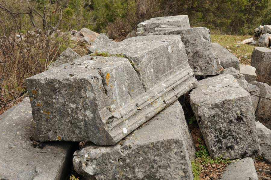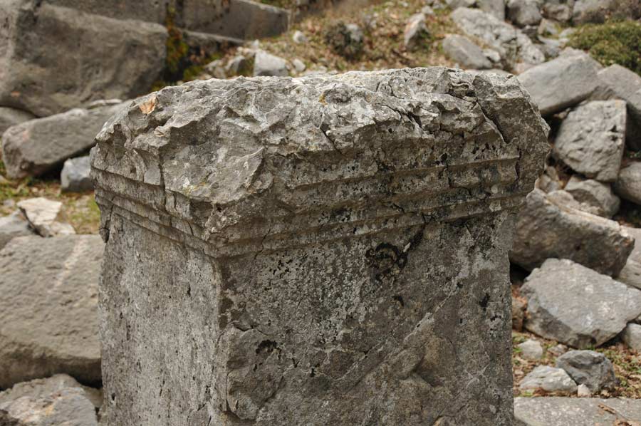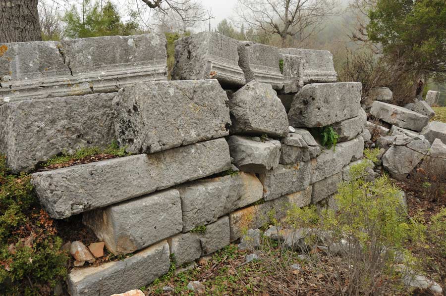 The agora (market place) with shops in the western part is in less good condition. To the north are seats arranged in a semicircle, the lower row decorated with two lion feet, a so-called exedra, where the townspeople and philosophers could discuss and relax. The nearby Caesar Temple was built by Emperor Claudius (41-54 AD). Even though the town was ethnically Greek during Roman times, as were many places on the south coast of Asia Minor, it was one of the first towns in Cilicia where the Roman emperor was worshipped along with other gods. At the south end of the agora are the public baths and further south the necropoli. To the east one can see an odeon (covered theatre for meetings and concerts) or bouleuterion (meeting place for the city council), on Emperor Street, which used to be lined with columns. But this street is almost impossible to find amid all the piles of stones. On the seats of the odeon is a turned over stone from the 3rd century commemorating Toues, a high priest and member of the city council. The Greek text also tells that he had occupied all the functions of the city, arranged two festivals and financed the bridge across Melas (Manavgat), so that also Side had honoured him with a statue.