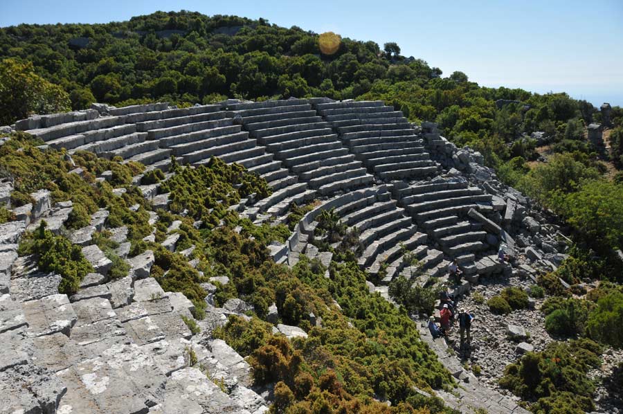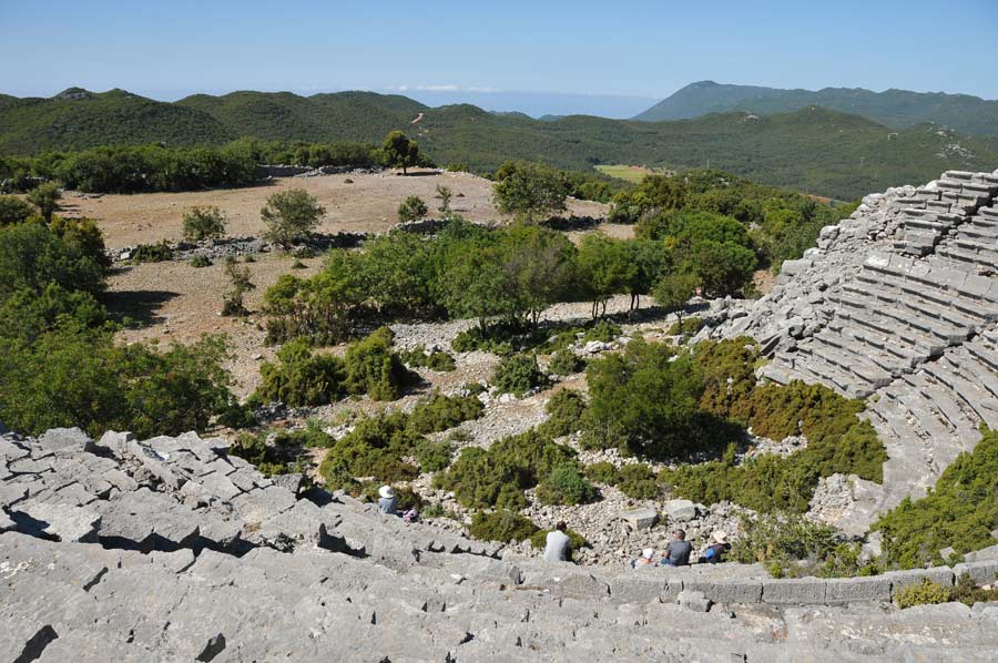 Once arrived in the ruined city, the primary interest of course was the theater, however, derived from early Hellenistic period. Here we initially paused again, listened the voices of nature before Wolfgang's first explanations started. Kyaneai already existed as a fortified settlement with a castle in the Archaic and Classical period, but probably just as dependent seat of the local Dynasten, which was managed from the nearby settlement on Avşar Tepesi (probably identical to the Lycian city Zagaba). The Lycian name of Kyaneai probably was Khbahñ, a name that is mentioned in the inscription pillar of Xanthos. Zagaba probably had held the function of a central place for the region in this early period, but went well in the first half of the 4th century BC during political and military conflicts between the dynasty of Xanthos and the dynasty of Limyra.