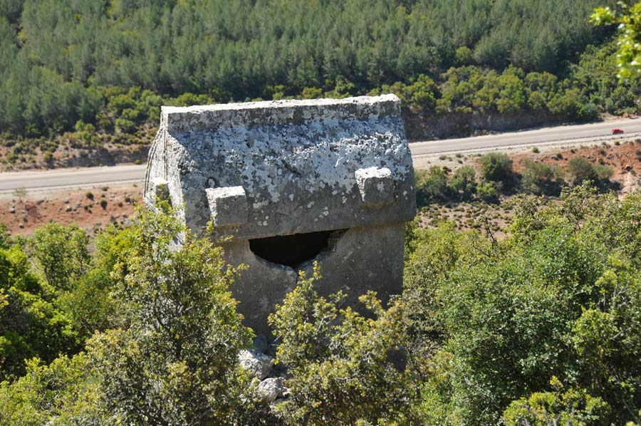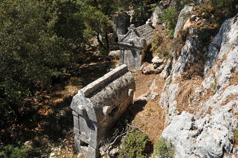 Kyaneai has more than 380 sarcophagi, the largest necropolis of sarcophagi in Lycia. Most of the local tombs are characterized by the ogival form of covering specifically used in this landscape. The most significant sarcophagus of Kyaneai dates from the first half of the 4th century BC. It shows various relief's and Lycian inscription. In it, a person called Khudalijẽ was buried, which certainly is one of the dynasts´ of Kyaneai.
