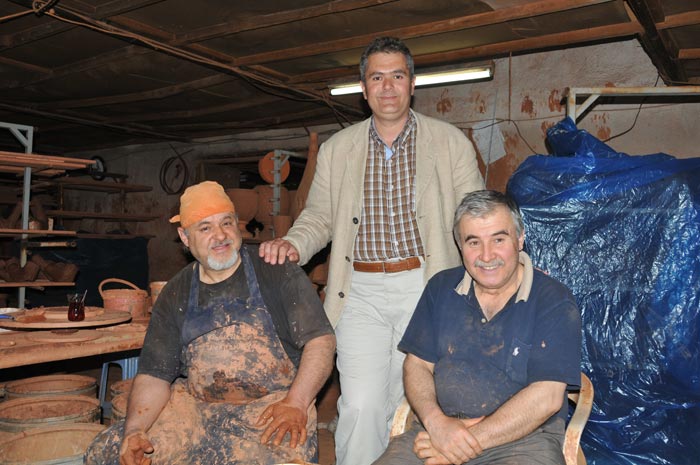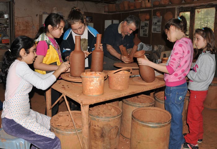 Menemen'in ayakta kalabilen eski ve ender yapılarından biri olan Papaz'ın Evi ziyaretimizden sonra Taner ve Mehmet Usta'nın atölyesine tekrar uğruyoruz. Güzel bir pazar etkinliği var burada. Mehmet usta, İzmir'in Bayraklı semtinden gelen öğrencilere çarktan alınıp deri sertliğine gelen çömlekleri kazıma tekniği ile dekor uygulanmasını öğretiyor. Taner usta ise çömlekçi çarkı ile temel biçimlendirme çalışmaları hakkında bilgiler veriyor.