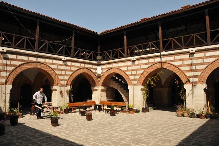 Rum Kilisesi olarak bilinen Agios Konstantinos Kilisesi'nin 19. yy ikinci yarısı ile 20. yy başları arasındaki bir tarihte inşa edildiği düşünülüyor. Menemen şehir turuna devam ediyoruz ve soluğu Taşhan'da alıyoruz. Kitabesi kayıp olduğundan kesin yapılış tarihi bilinmeyen, İslam mimarisinin yaşayan örneklerinden Taşhan'da hem dinlenme molası veriyoruz hem handa yer alan farklı el sanatları atölyesi ile Menemen Çömlekçiler Derneği ofisini ziyaret ediyoruz.