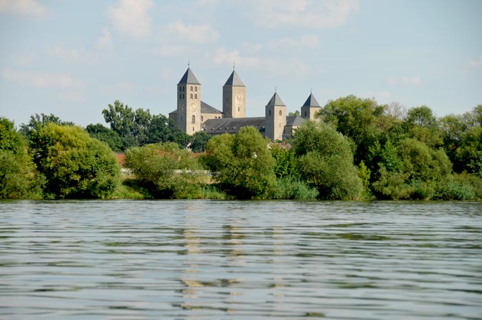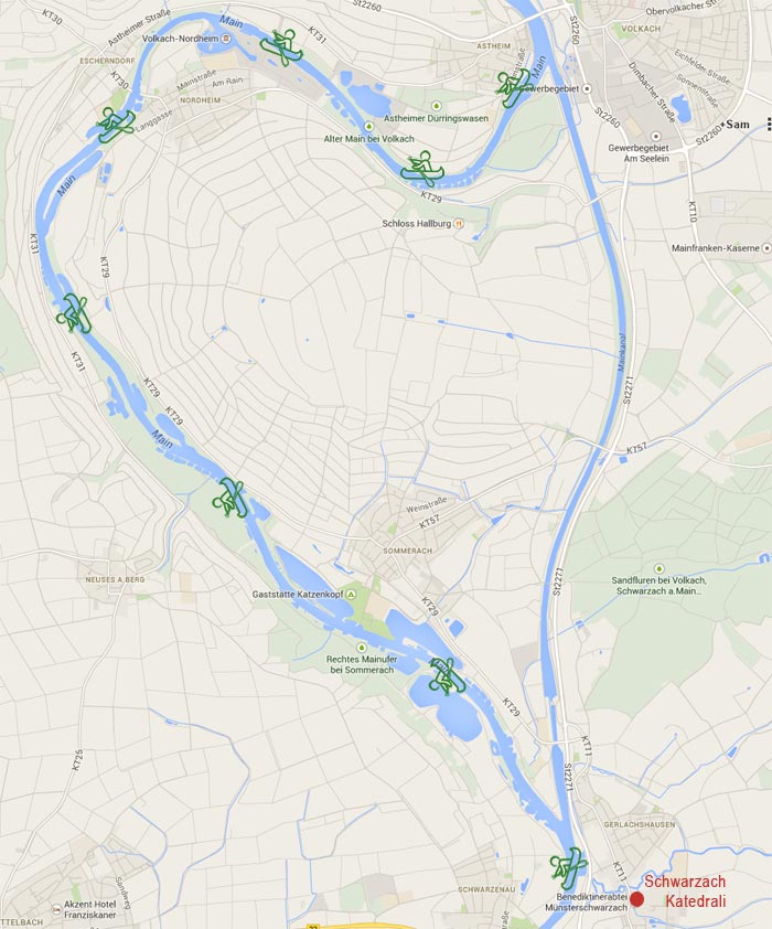 Kitzingen şehrine bağlı Schwarzach a. Main ilçesinin meşhur katedrali ufukta göründü. Münsterschwarzach Abbey olarak bilinen başkilise eskiden Schwarzach Manastırı olarak anılıyordu. Schwarzach a. Main, Frankonya Bölgesi'nin beğenilen turistik cazibe merkezlerinden biridir.