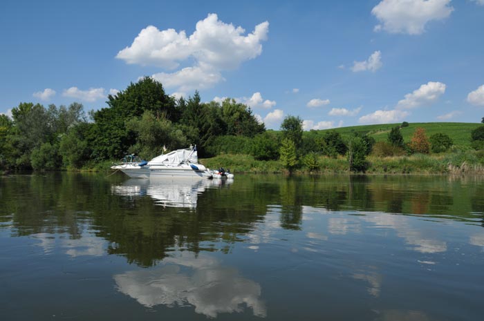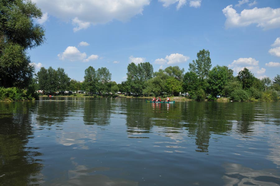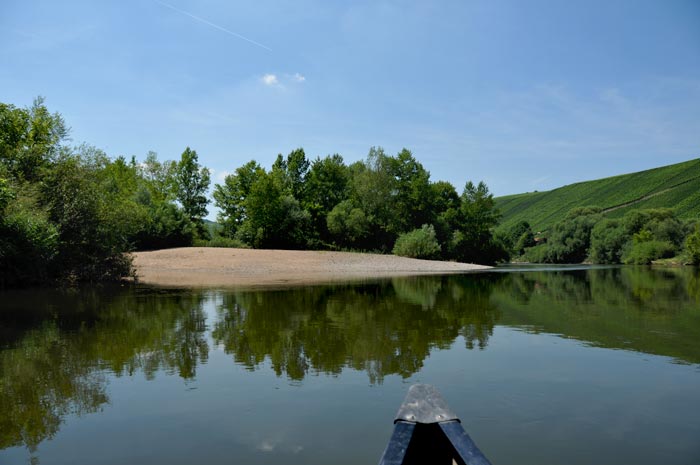 Eski Main nehri seviyesine iniyoruz ve kano gezi rotamıza buradan başlıyoruz. Bizi karşılayan harikulade güzellilteki doğa sığ kumsallarından birini sunuyor hizmetimize. Arkada yamaçlarda Frankonya Bölgesi'nin meşhur asma bağlarını görüyoruz.