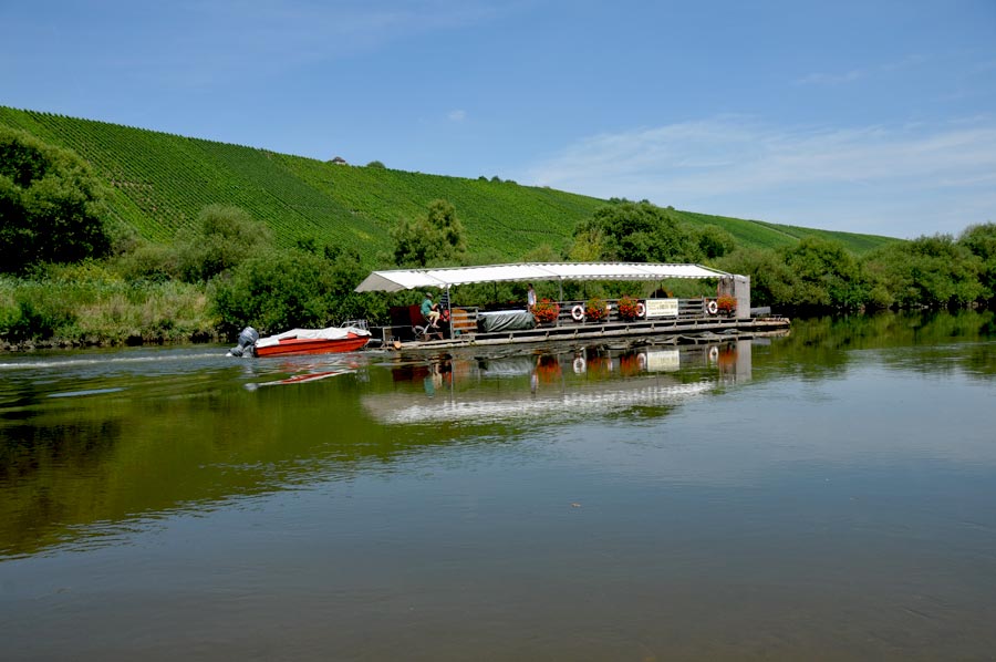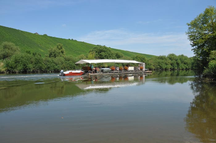 Main Nehri'nin yüzen restoranı yolcularını almak üzere iskelesine doğru yol alıyor. Böylesine güzel havada yüzen ahşap bir sal üzerinde yenen öğle yemeği ve yanında beyaz Frankonya şarabı eminim ki unutulmayacak bir deneyim olacaktır.