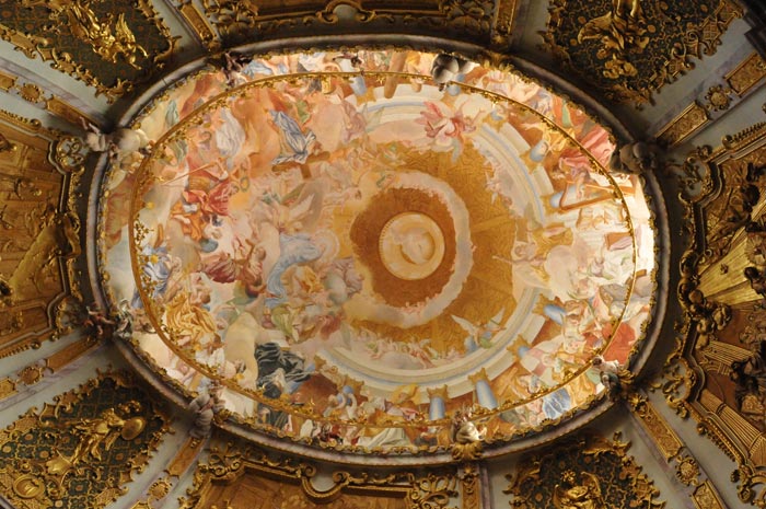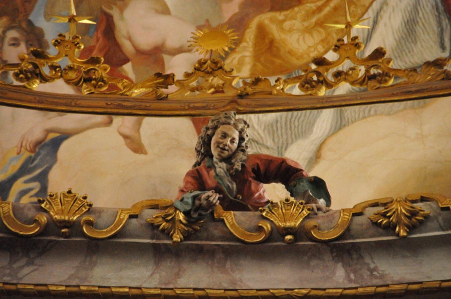 Kilisenin içine doğal ışık getirmek için yapılan ışık bandının da yardımı ile düz tavan gerçekten ustalık gerektiren freskler sayesinde neredeyse üç boyutlu bir hal alarak oval bir kubbe gibi görünüyor. Barok stili altın yaldızlı ve çiçekli süslemeler; bulutlara sarılmış melek tasvirleriyle dolu manastır kilisesinin iç dekorasyonunun göz alıcı olduğunu söylemeden edemeyeceğim. Fakat benim en fazla ilgimi çeken, kilisenin tavanındaki banttan eğilmiş sürekli bizi gözetleyen ünlü Barok mimar ve ressamı Cosmas Damian Asam heykeli oluyor. Fotoğraf galerisinde heykeli görebilirsiniz.
