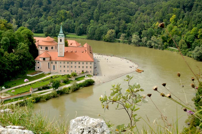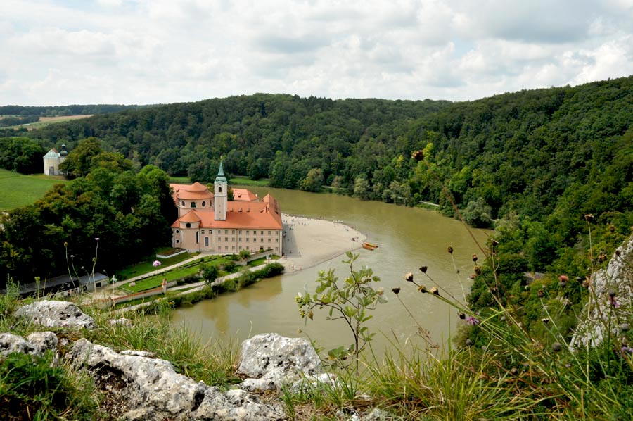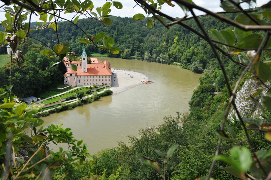 Bir süre sonra başka bir seyir terasına ulaşıyoruz ve Tuna nehrinin kanyona akmadan önceki bir dirseğin kenarına kurulmuş olan Weltenburg manastırını öncelikle buradan görmelisiniz. Almanya'da bira üretimi yapan en eski manastır ünvanına sahip olan Weltenburg Manastırı'nın görkemli manzarası ve Tuna nehrinin döndüğü köşedeki kum sahil buradan oldukça etkileyici görünüyor. Kısa bir moladan sonra hedefimize ulaşmak için parkura devam etmemiz gerektiğini anımsıyor ve yola koyuluyoruz.