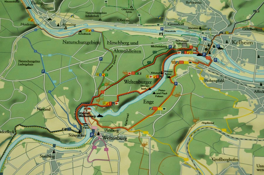 Kelheim ve Weltenburg Manastırı arasında düzenli olarak çalışan gezi tekneleri Tuna Boğazı'nı katediyor. Tuna Nehri boyunca devam eden yürüyüş parkuru Tuna Boğazı girişinde nehirden uzaklaşıyor. Buradan sağa dönüyor ve ormanlık bir araziye giriyoruz.