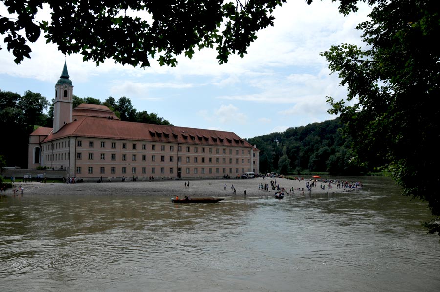 Weltenburg Manastırı'nın tam da karşı yakasında Tuna nehri ile buluşuyoruz. Karşı kıyıya geçebilmek için hemen yolcu bekleyen kayığa kendimizi atıyoruz. İşte şimdi Tuna nehrini kayıkla aşıyoruz ve kum olduğunu düşündüğümüz plajın nehir tarafından taşınan çakıllardan oluştuğunu buradan net bir şekilde fark edebiliyoruz.