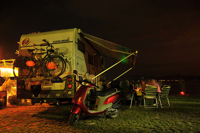 Camping Rino, Ohrid gölü kıyısında olduğundan şahane görüntüler sunuyor bize. Güzel ve aydınlık bir gecede karşıda Ohrid şehri göz kırpıyor ve ben kameranın başında nöbet tutuyorum.