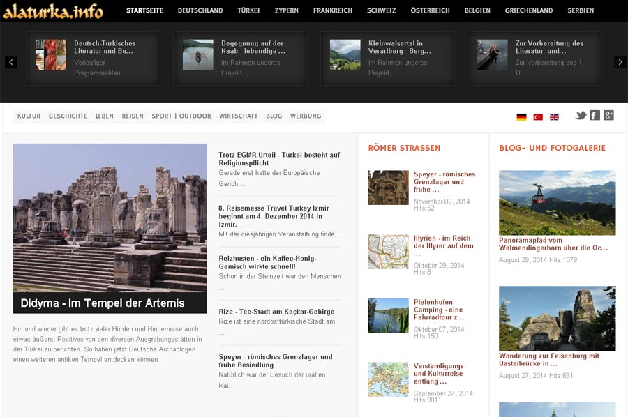 Alaturka.Info™ portalı Roma yolları boyunca Avrupa ve Akdeniz'de seyahat destinasyonları, turizm, kültür, tarih, mutfak spesiyaliteleri, gayrimenkul, sağlık ve güzellik, spor ve yaşamı kapsamaktadır ve Türkçe, İngilizce, Almanca yayın yapmaktadır.