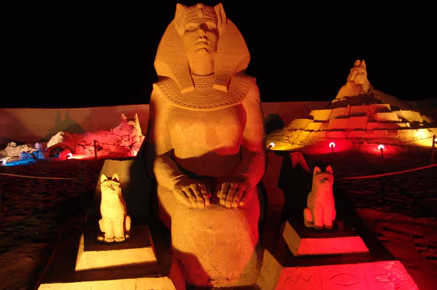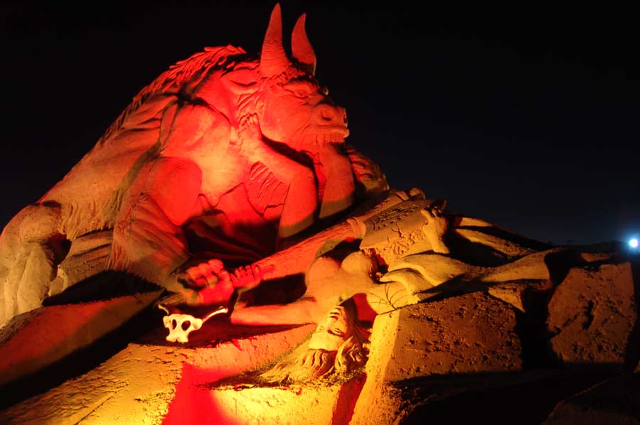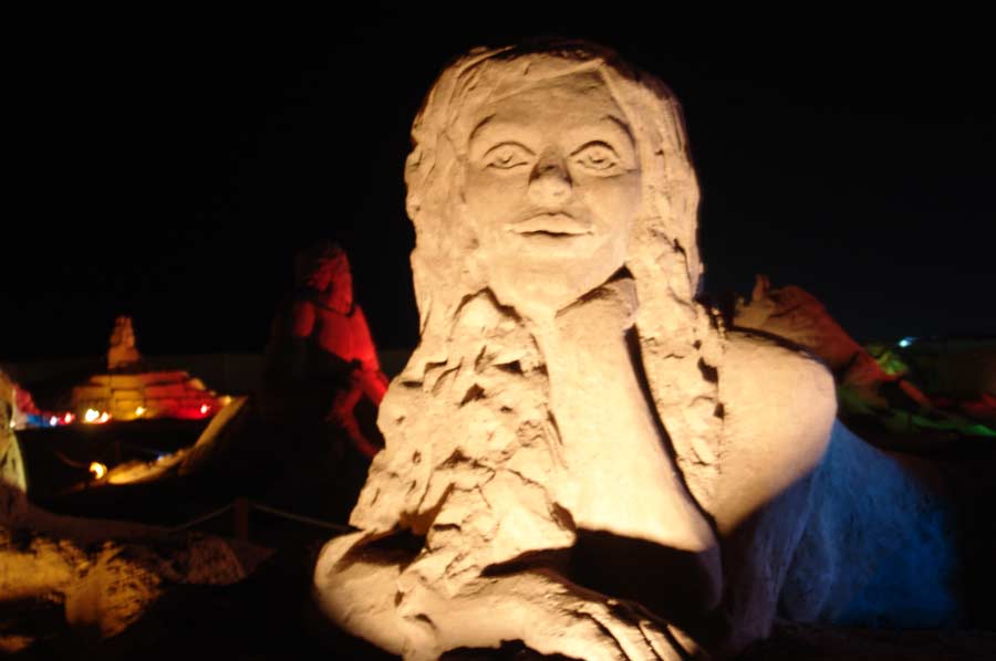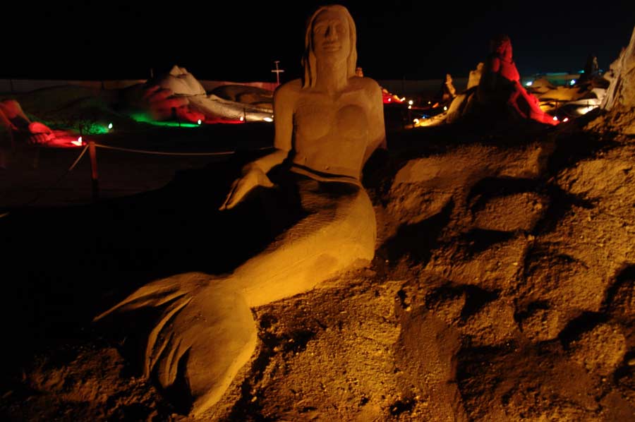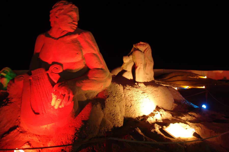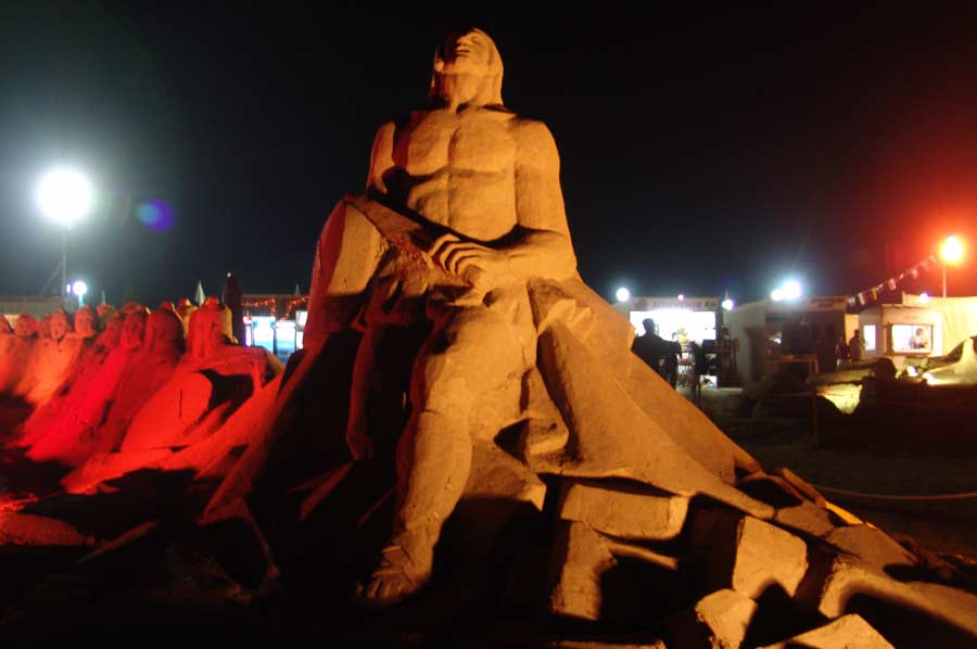 Toplam 10 ülkeden gelen 40 sanatçının meydana getirdiği bu kumdan heykel sergisi sonbaharın sonuna kadar açık olacak. Tabii iklim koşullarına bağlı olarak. Burada sadece suyla birleştirilerek yoğunlaştırılmış olan özel bir nehir kumu (tanecikler daha köşeli olduğundan daha fazla biçimsel istikrar sunuyor) kullanılmış ve gerçek bir el zanaatkarlığıyla sanatçılar tarafından mitolojik kumdan heykellere dönüştürülmüştür. Rüzgarın ve özellikle de yağmurun sergiye zamanından önce son verebilecek olduğu gayet açık görünüyor.
