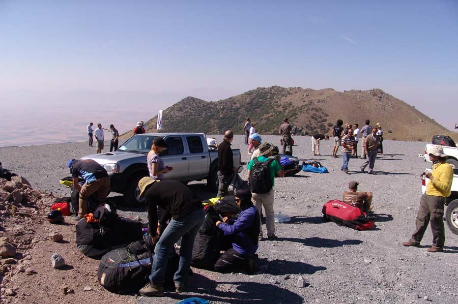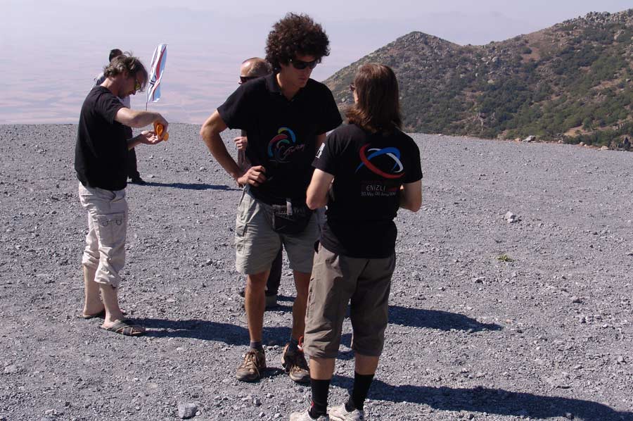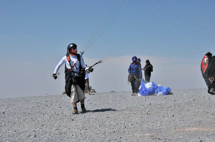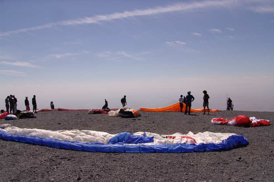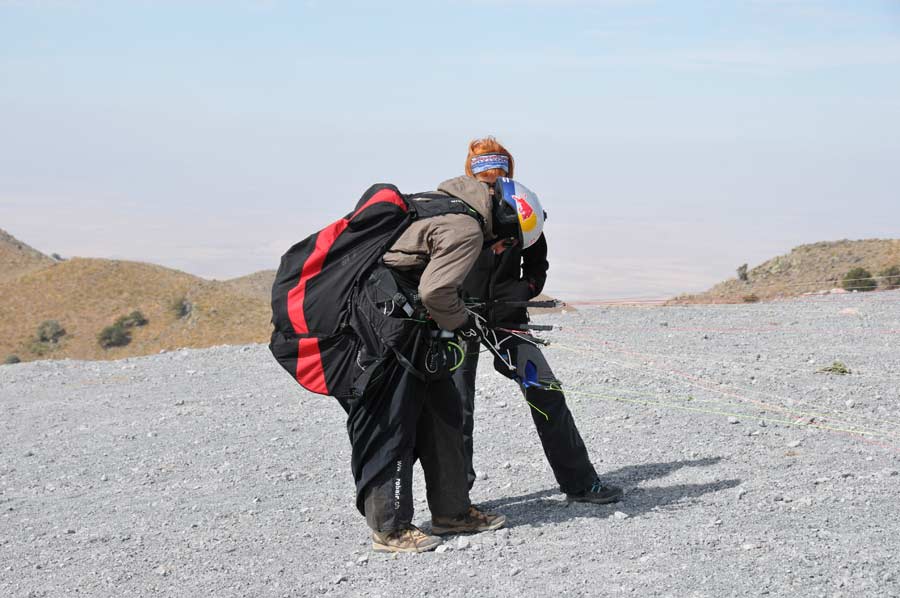 Kalkış hazırlıkları sırasında bazı pilotlarla görüşme yapma olanağını bulduk. Böylece yamaç paraşütçülerinin dünyasını adım adım daha net olarak anlayabildik. Paraşütü, taşıyıcı sistemin farklı renklerdeki halatlarını ve bunların işlevlerini, sırt çantasının içeriğini ve teknik donanımı bize açıkladılar. Çok ilginç ve kesinlikle yeni bir konu bizim için.