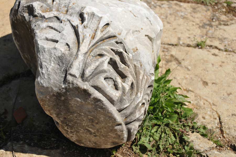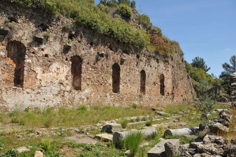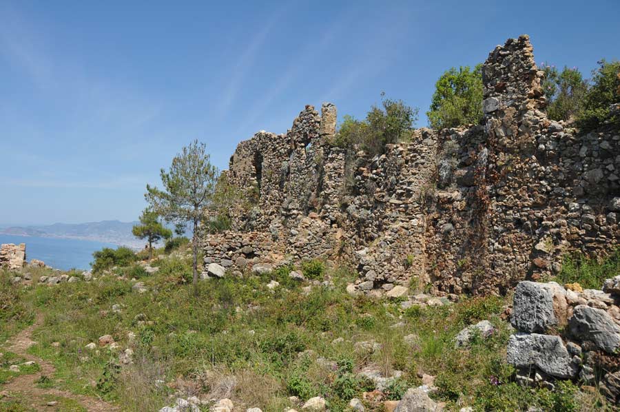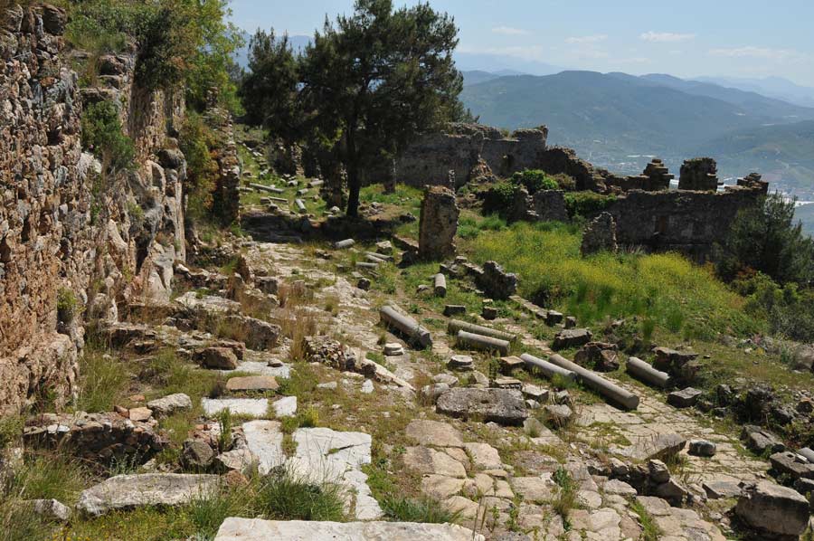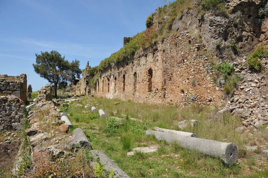Çok da yorucu olmayan bir tırmanıştan sonra kentin doğusunda, çok görkemli bir yapı kalıntısı olan Roma banyosu ile karşılaşıyoruz ve zemininde yer yer mozaik kalıntıları görüyoruz. Roma banyosunun hemen batısında kentin en önemli unsurlarından biri olan sütunlu cadde uzanmaktadır. Bir defa bu caddeye ulaştıktan sonra zirveye çıkmak ve başdöndürücü manzaraya şahit olmak kaçınılmaz olacaktır. 1994 yılından bu yana Alanya Müze Müdürlüğü tarafından yapılan kazılar sonucunda, sütunlu caddenin, 250 x 10 metre boyutlarında ve kuzeyi sütunların taşıdığı ahşap çatı ile kapalı, güneyi taş döşemeli açık yol şeklinde olduğu ortaya çıkmıştır.