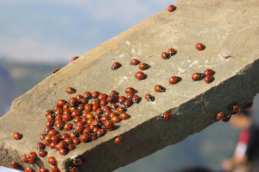 Hangi kayayı kımıldatsanız, birbirlerine sokulmuş onlarca uğur böceğini görebilirdiniz. Kimileri ise, kendilerini kayaların üzerinde sere serpe bırakmışlardı. Bir demet uğur böceği, kocaman açılmış bir kucakla gelebilecek mutluluk enerjisi veriyordu her birimize. Birbirleri üstüne tırmanıyorlar, birbirlerine daha çok sokuluyorlar, taliplilerine görsel bir tanzim sunuyorlardı.