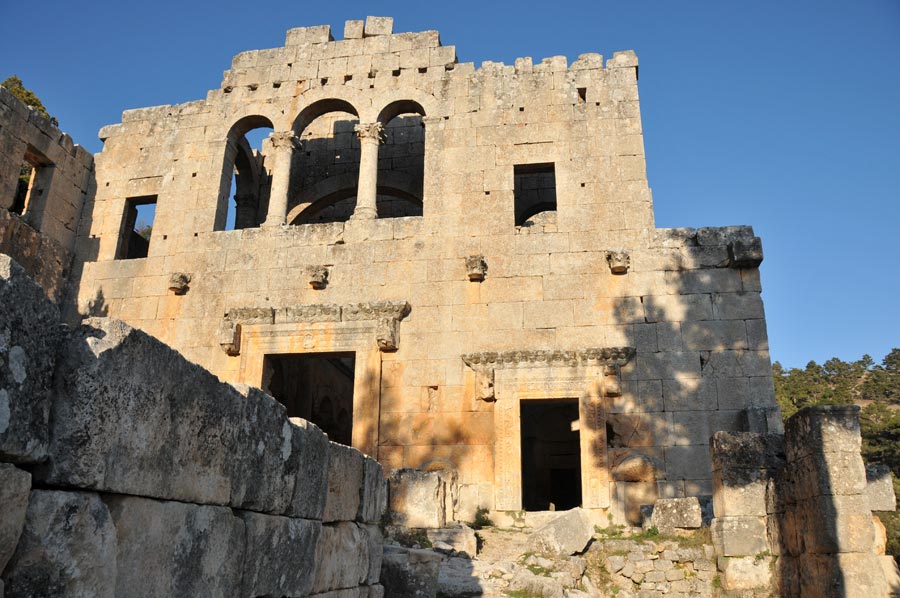 Manastır kompleksinin tamamı, bir zamanlar şu dört ana bölümden oluşuyormuş: Evangelist bazilikası, vaftizhane, doğu kilisesi ve sütunlu yol. Biz manastır alanına sütunlu yol (porticus) üzerinden adım atıyoruz. Bu yol yaklaşık 130 metre uzunluğunda ve hemen hemen 5 metre genişliğinde olup, bütün uzunluğu boyunca Göksu vadisinin panoramasını sunuyor. Geçmişte bu sütunlu yol üzerinden doğu kilisesine doğru yürümek, etkileyici bir şey olmuş olsa gerek. Büyüklüğü dolayısıyla etkileyici ve mimari üslubu nedeniyle de hayranlık uyandırıcı olduğu için, önce doğu bazilikasına yöneliyoruz. Burası, manastır külliyesinin günümüze dek en iyi şekilde korunarak gelmiş olan kısmı. Bugüne kadar 1600 yıldır doğaya karşı koymuş olan taş süslemelerini hayranlıkla inceliyor ve gözlerimizi bir türlü süslemelerden alamıyoruz. Bugün dahi o kadar güzeller ki. Taş bloklarının birbirlerine nasıl bitiştirildiğine bakarak, burada ileri seviyedeki bir zanaatkarlığın söz konusu olduğunu anlıyoruz. İki melek tarafından çevrelenen bir İsa Mesih büstü de ana kapıda gayet net olarak görülebiliyor hâlâ. Yine bazilikanın taşa oyulmuş bir planıyla da karşılaşıyoruz.