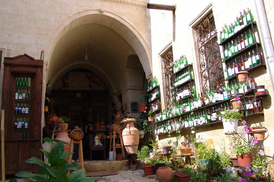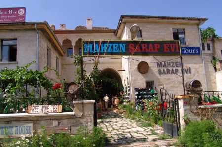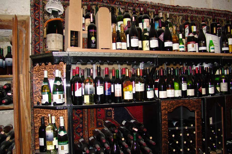 için “Ürgüp Şarap Evleri”nden daha iyisi aklımıza gelmedi. Evin girişi de çok cazipti. Ahşap raflar ve kaya mahzende sıralanmış dolu şarap şişeleri çok ilginçti.