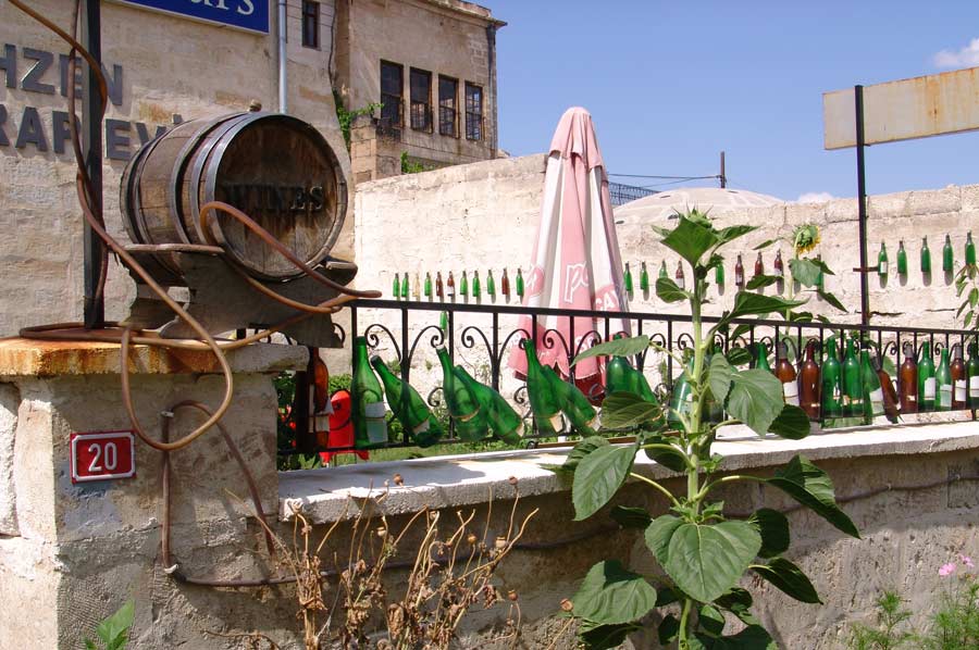 Ürgüp merkezinde bahçe duvarı dekorasyon amacıyla sayısız şarap şişesinden örülmüş çok ilginç bir şarap evi gördük.